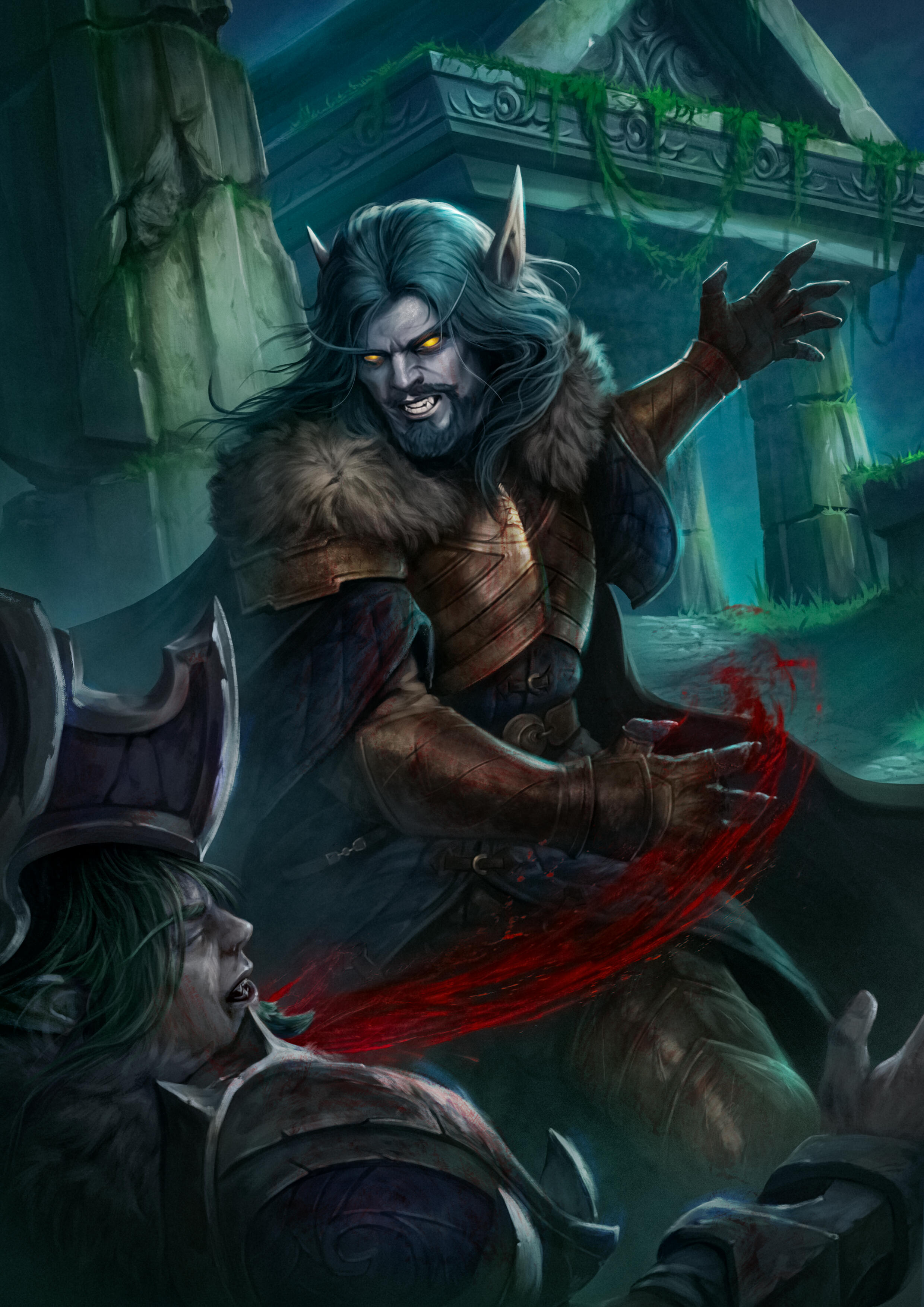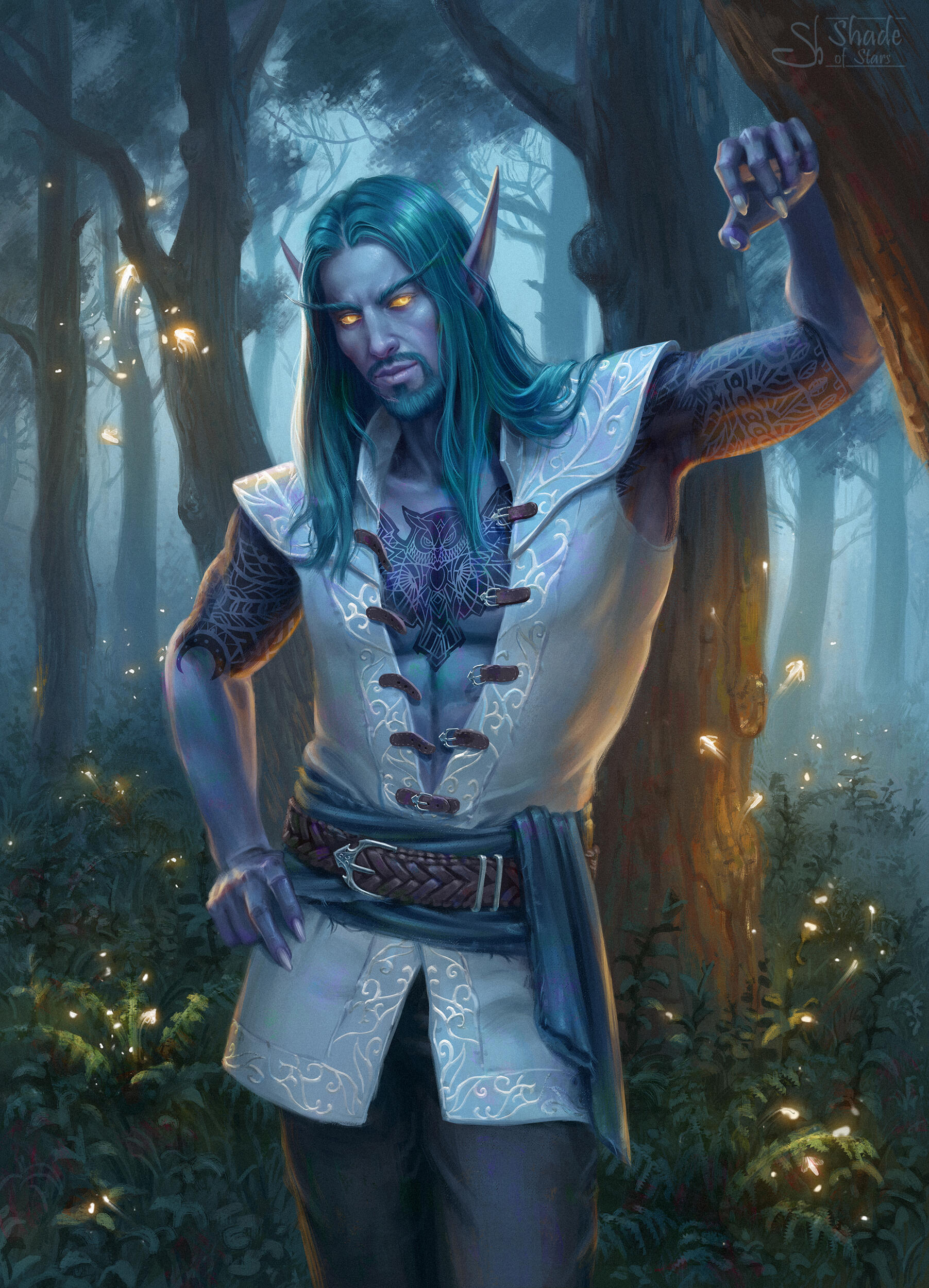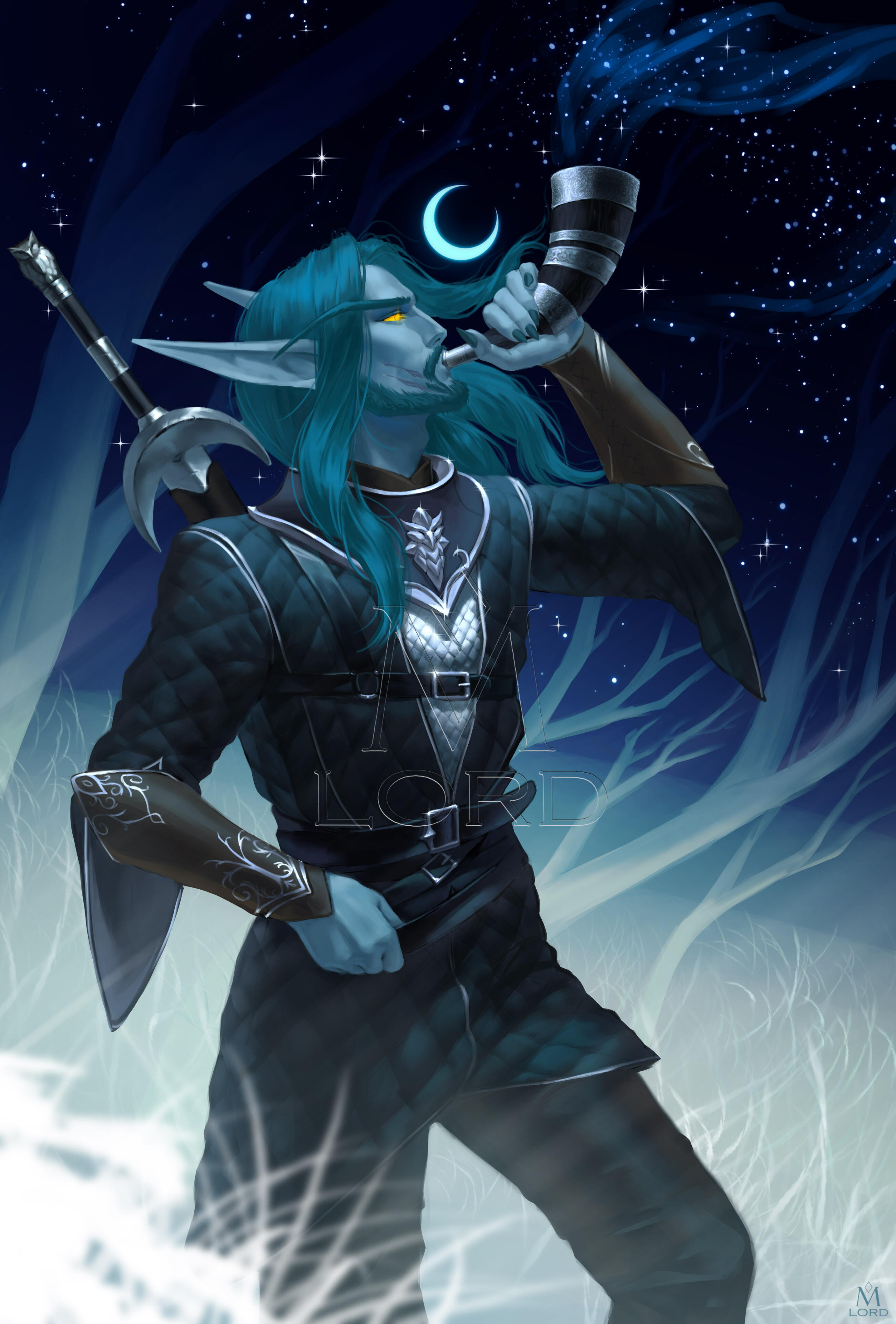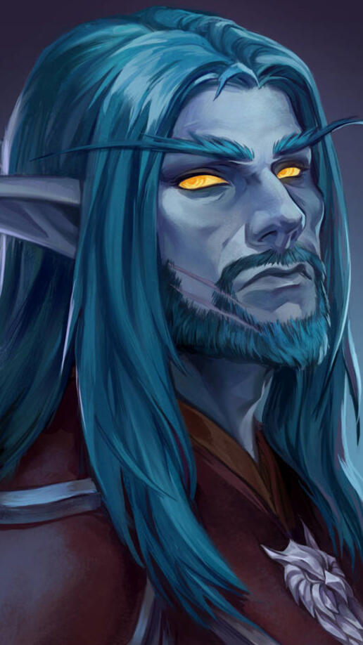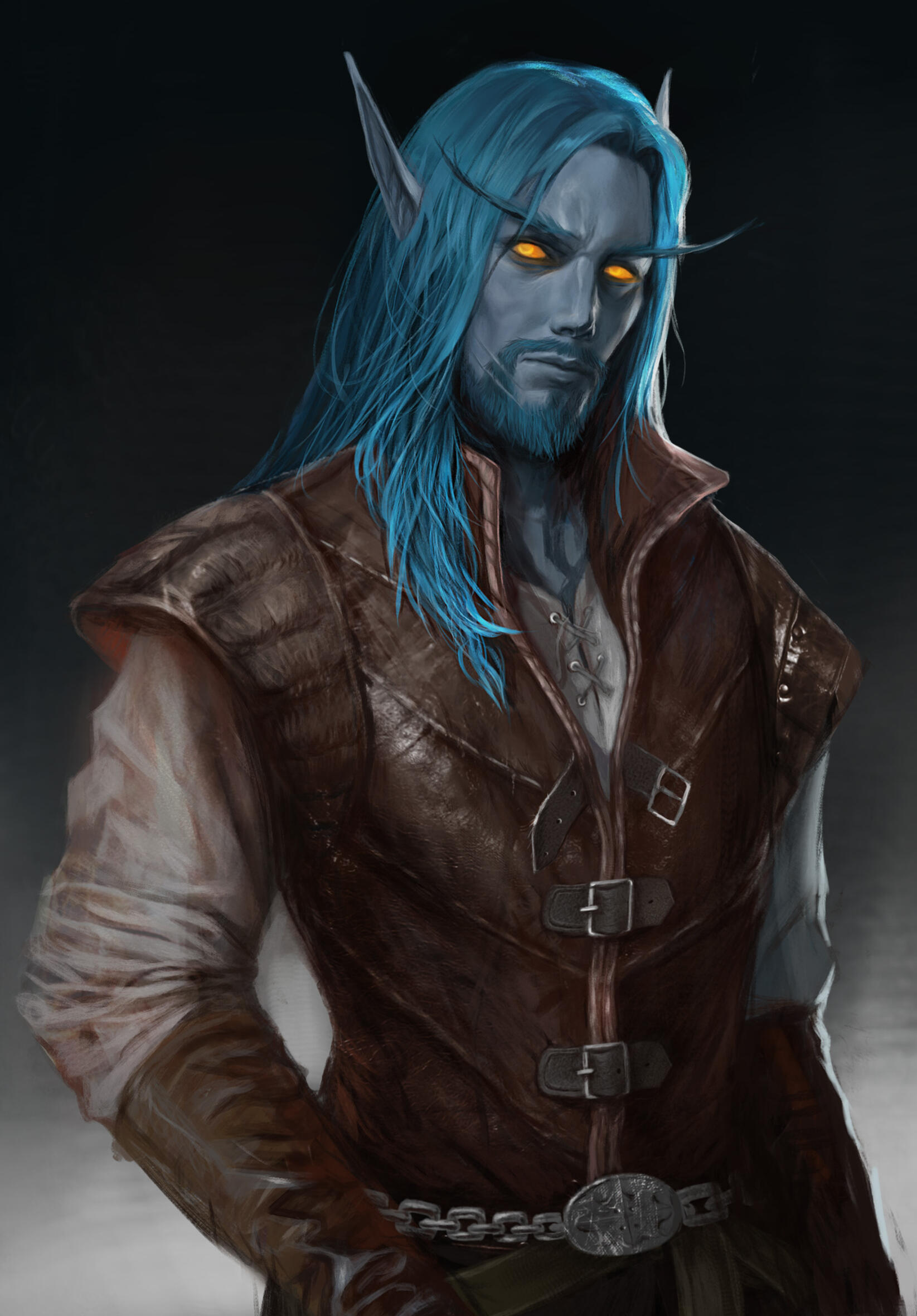 Kaernin Windweaver is, like most of his kin, a physically striking creature; tall with a lanky but muscular frame. A great mane of turquoise hair plumes from his crown, while a neatly trimmed beard frames his jawline. His visage is defined by a long nose and high cheekbones, twinned with great arching brows and eyes which, as one would expect, glow with pure amber.At a glance he is timeless and, if one were to judge him by human standards, it would be difficult to place him any further than his fourth decade. While his face lacks any significant wear, on closer inspection, two parallel scars are hidden under the length of bristles, the marring long since healed with faint evidence remaining.